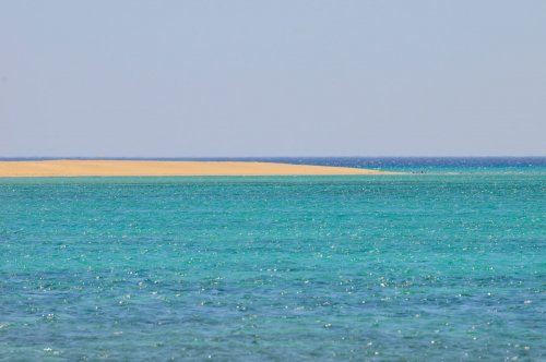 Χρυσαφένιοι αμμόλοφοι καταλήγουν απαλά σε τιρκουάζ νερά που ενώνονται πέρα μακριά, στη γραμμή του ορίζοντα, με έναν ανέφελο ουρανό.