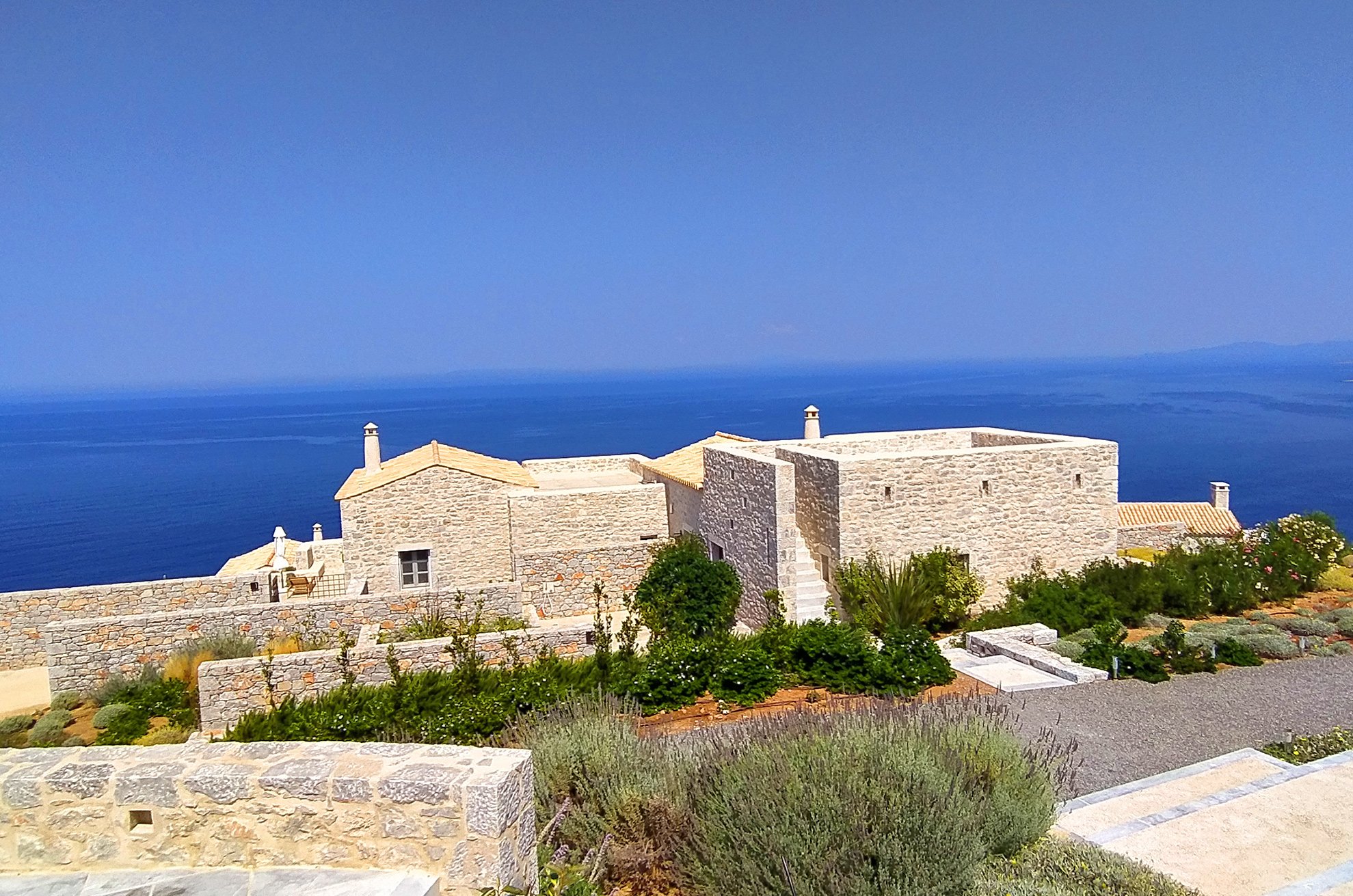 Η πόρτα της σουίτας μου ανοίγει σε μια ιδιωτική αυλή με πέτρινα τειχάκια, πλημμυρισμένη από τη μυρωδιά της πικροδάφνης και της λεβάντας, τη θέα της θάλασσας από τη μια και των ορεινών όγκων του Ταΰγετου από την άλλη, και τους ήχους από κελαηδίσματα και τζιτζίκια, που φτιάχνουν μαζί την τέλεια μελωδία.